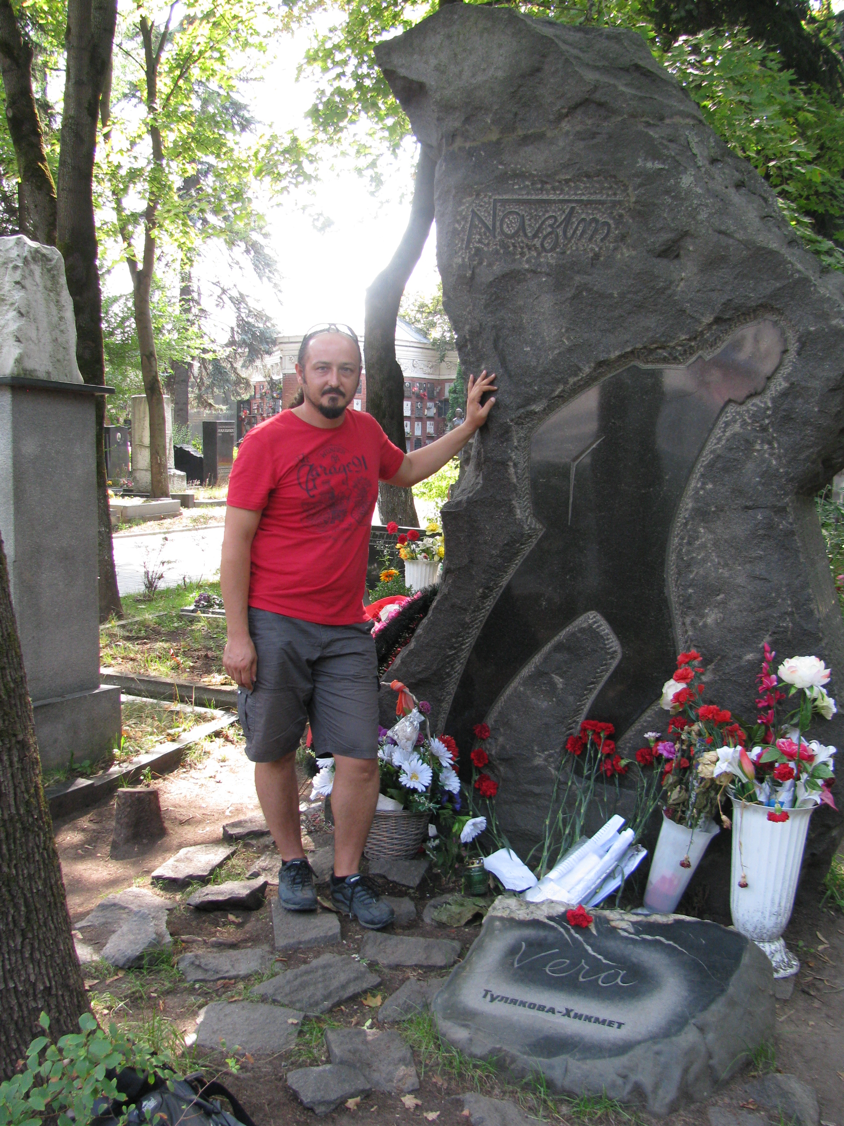 Nazım Hikmet’in mezarını buldum. Uzun zamandır buraya gelmek istediğim için çok heyecanlıyım. Ve sonunda gelmiştim. Buradaki mezarlar hep süslü, heykelli güzel mezarlar. Nazım Hikmet’in mezarından güzel mezarlar var ama hiç birinde O’nun mezarında ki kadar çok çiçek ve sevgi dolu mektuplar yok. Herkes ona sevgi dolu mesajlar yazmış. Nazım Hikmet’in mezarının önünde ise sevgilisi Vera’nın mezarı var. Vera’nın vasiyeti, Nazım Hikmet’in yanına gömülmekmiş. Fakat yer olmadığı için yakılıp küllerini Nazım Hikmet’in mezarının yanına koymuşlar.