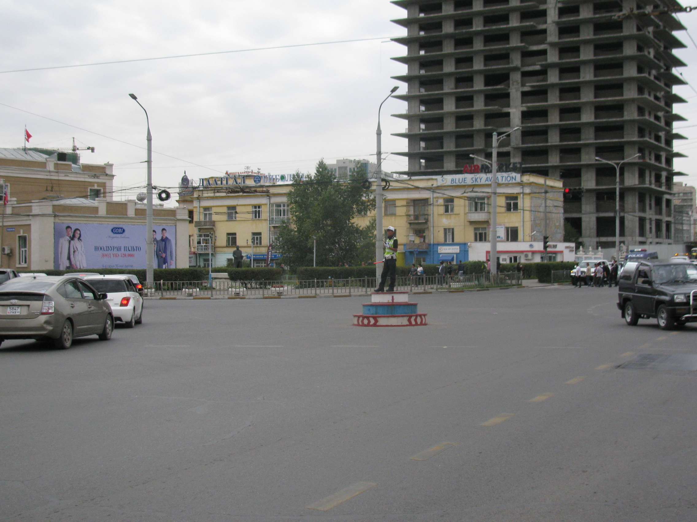 Oradan meşhur meydan Suhkbaatar meydanına geldim. Şehre de ismini veren Suhkbaatar, Moğolların Cengizhan’dan sonra en çok sevdikleri kahramanları. Yakın tarihte Moğolistan’ın bağımsızlığında en çok rolü olan lider. Meydana bakan kocaman bir hükümet binası var. Hükümet binasının önünde kocaman asıl adı Temuçin olan Cengizhan var. Cengizhan’nın bir yanında Ögeday Han, diğer yanında Hülagü Han oturuyor. Meydan gerçekten büyük. Çevresinde de bol miktarda inşaat var.