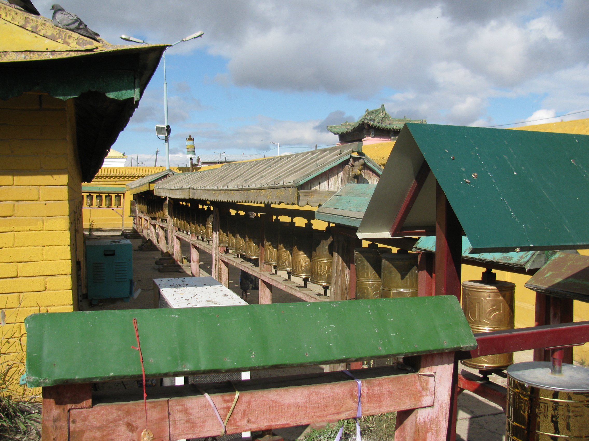 Tapınak kültürüm yok. Daha dün bir bu gün iki. O yüzden kocaman tapınak kompleksine girince doğal olarak şaşırdım hangisine gireceğimi. Meğer orada çalışan görevli budistlerin kaldığı yere girmişim. Neyse budist kardeş bana girilmeyeceğini söyleyince ben de çıktım. Bu sefer çoğunluğun gittiği yere doğru gittim. Kocaman bir tapınak çıktı karşıma. İçeri girdim. Meğer doğru yer burasıymış karşıma metrelerce uzunluğunda kocaman bir buda çıktı. Etrafımdaki herkes minnettar bir şekilde tapınıyor. İçeri giren herkes, altın rengi dönen, şeyleri çeviriyor. Yüzlerini heykellere sürüyor. Ben de budanın etrafında bir tur attım. Bu arada fotoğraf çekmek yasak ama ben çaktırmadan iki tane çektim. ( Bu tapınağın panaromik fotoğrafı http://www.360cities.net/image/megjid-janraisig-asia adresinde var. Çok da güzel yapmışlar.)