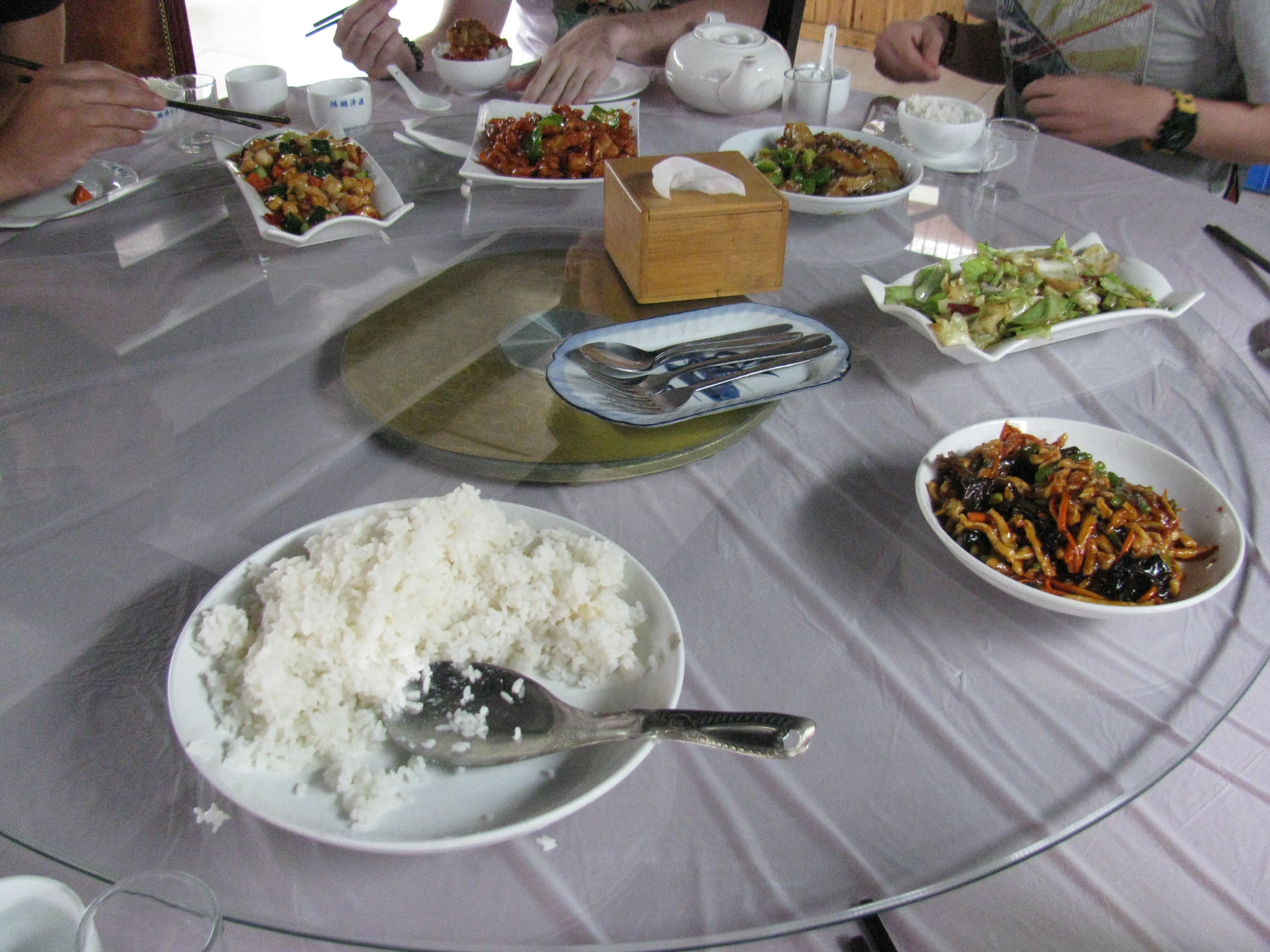 Daracık yollarda tırmanarak Seddi’n girişine geldik. Önce öğle yemeği yiyecekmişiz. Girdik bir Çin restoranına. Her şer tam olarak yerel. Tabaklar, döner masa, yemekler tam Çin usulü. Hepimiz oturduk. İlk hamleyi yapacak kişiyi bekliyoruz. Yanımızda rehber de yok. İlk hamle Polonya’lı Agatha’dan geldi. Başladık. 7 tabak yemeği tatmaya. İlk defa bu kadar detaylı çin yemeği yiyorum. Yemekte tanıdığım sadece portakallı pekin ördeği ile pirinç pilavı vardı. Genel anlamda yemekler yenmeyecek kadar kötü değil. Hatta bazılarını çok beğenenler de oldu. Ama kullandıkları koyu kıvamlı, hafif tatlı soslar yemeğin tadını çok değiştiriyor. Portakallı Pekin ördeğine gelince, ördek bildiğimiz ördek tek farkı portakallı sosu. Sos biraz şekerli, hatta baya şekerli. Et yemeği yerken fazla şeker beni bek sarmadı. Masa da çöp kullanamayan bir tek bendim. Baktım herkes kırk yıllık Çinli gibi çöp kullanıyor.