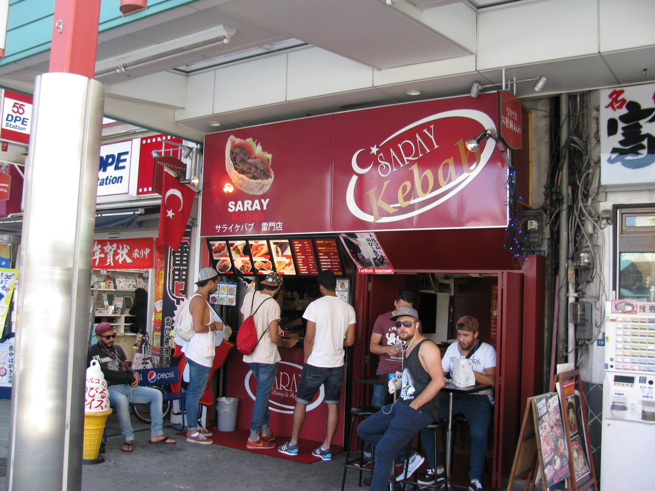 Gezi boyunca çok dönerci gördüm. Özellikle Çin ve Moğolistan’dakilerin yanına bile yaklaşılmayacak kadar kötü görünüyor. Zaten dönerciler de Türk değil. Bizim mahallede bir dönerciyle tanıştım. Burada ki dönerci çok farklı. Saray kebap. Sahibi Tahsin ile tanıştım. Tosyalıymış. Çok da iyi bir kişi. 15 sene önce Tokyo’ya gelmiş, evlenmiş, Tokyolu olmuş. Tokyo’da 5. Şubesini açmış. Döner, ayrının da tadına baktım. Gerçekten çok güzel. Yolunuz bir gün Asakusa’ya düşerse mutlaka Saray dönere uğrayın.