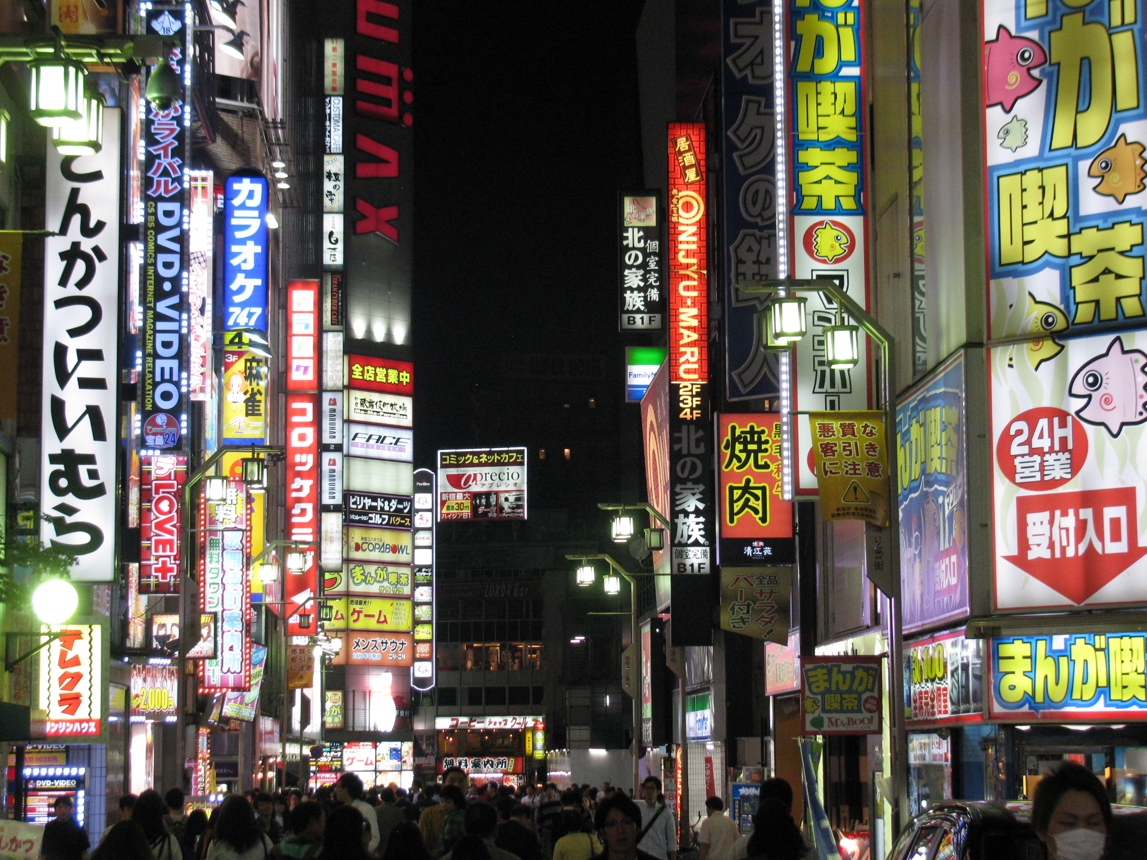 Mükemmel bir manzaradan sonra şehir kalabalığına karışma vakti geldi. Shinjuku’nun merkezine doğru yürürken hava kararmaya başladı. Biz Shinjuku’ya gelince hava artık iyice karanlıktı. Tokyo’da güneş yerini tabela ışıklarına bıraktı. Ortalık gündüz gibi aydınlık. Her yer, tabela ışıklar, müzik, insan sesleri ve sağa sola yürüyen insan seli. Herhalde Japonya’nın en kalabalık yerindeyiz. Bu insan selinin içinde Shinjuku’nun tam merkezi olan Kabukicho caddesine geldik. Burada tabela ışıkları ve insan seli yoğunluğu daha da arttı. Her sokaktan, her köşe başından eğlence yükseliyor. İnsan seli akıyor.