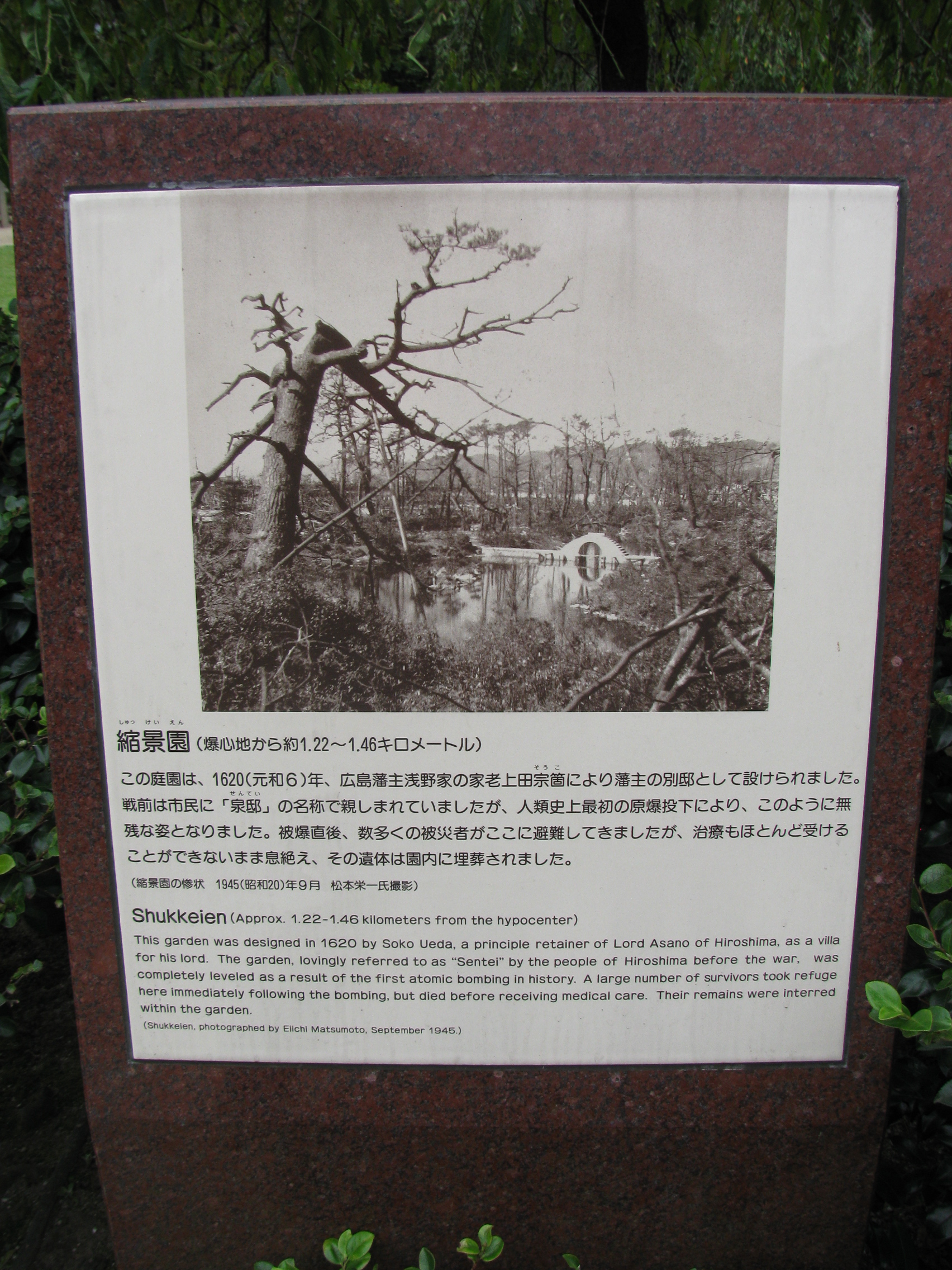 Bu gün genel anlamda park ve şehir gezmesi yapacağım. İlk olarak Shukkeien parkına gittim. Shukkeien parkı, 1620 yılında yapılan ve zamanla büyütülen tipik Japon stili parkların önde gelenlerinden. Hiroşima’da her tarihi, turistik yerler de olduğu gibi burası da 1945 yılından sonra restore edilmiş. Burada bu tür eskiden kalmış parkların, binaların caddelerin önünde 1945 ağustosunun bir resmi konulmuş.