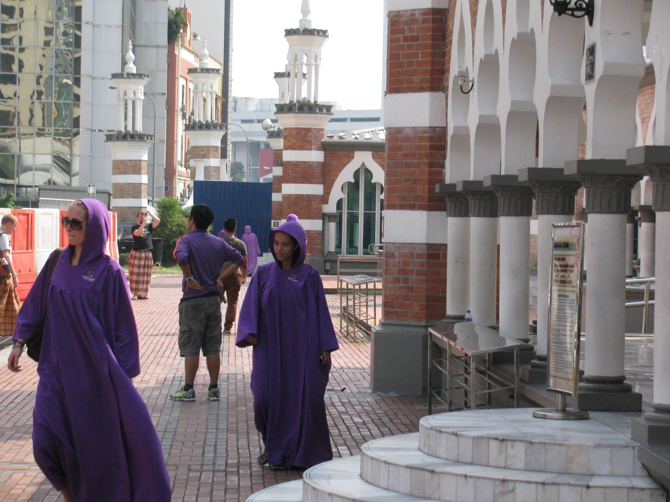 Meydanın arkasında Masjid Jamek, yani Jamek Camii var. Hayatımda gördüğüm en değişik cami. Zaten 1909 yılında yapılan camiyi, bir İngiliz mimara çizdirmişler. KL’nin en eski camisi. Kapısına geldim baktım. Erkeklere etek, kadınlara mor peçe giydiriyorlar. Caminin güzelliği ve merak uğruna giydik eteği. Küçük gibi görünüyor ama aslında büyük bir cami.