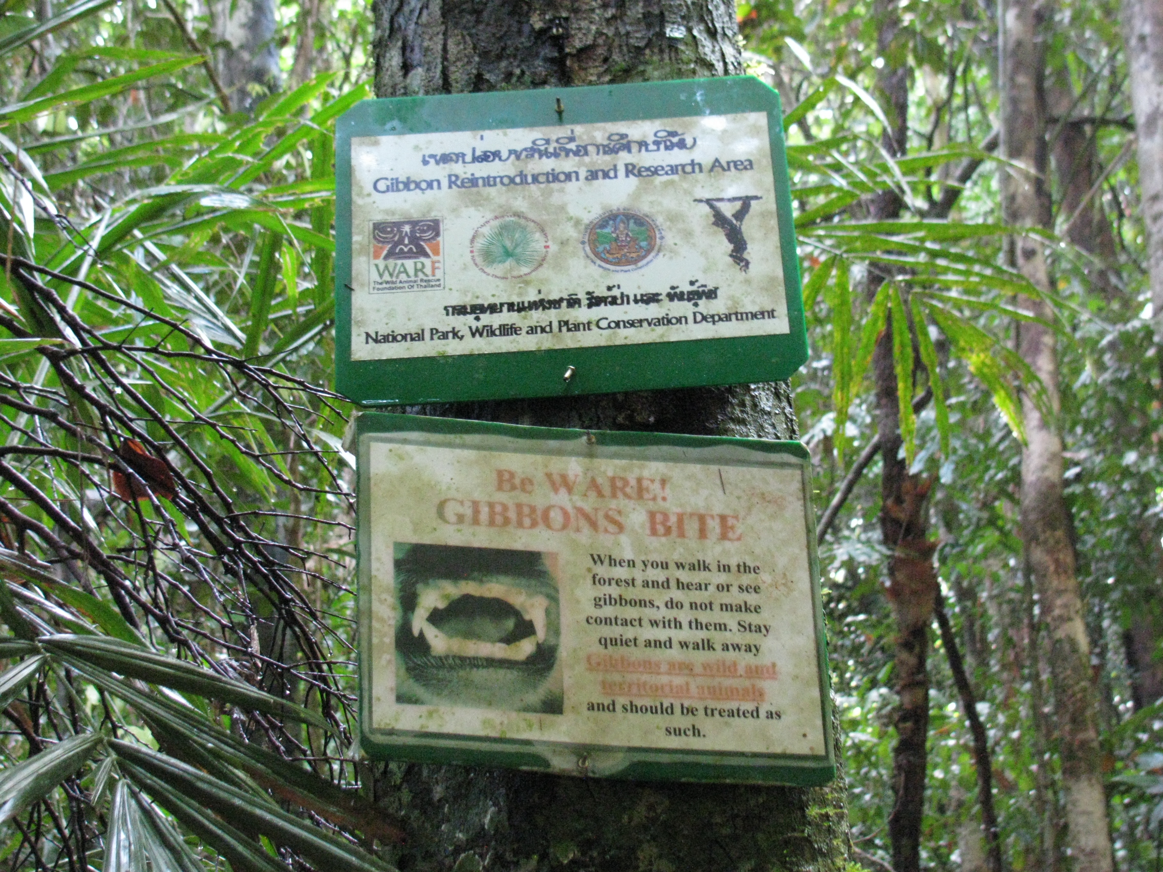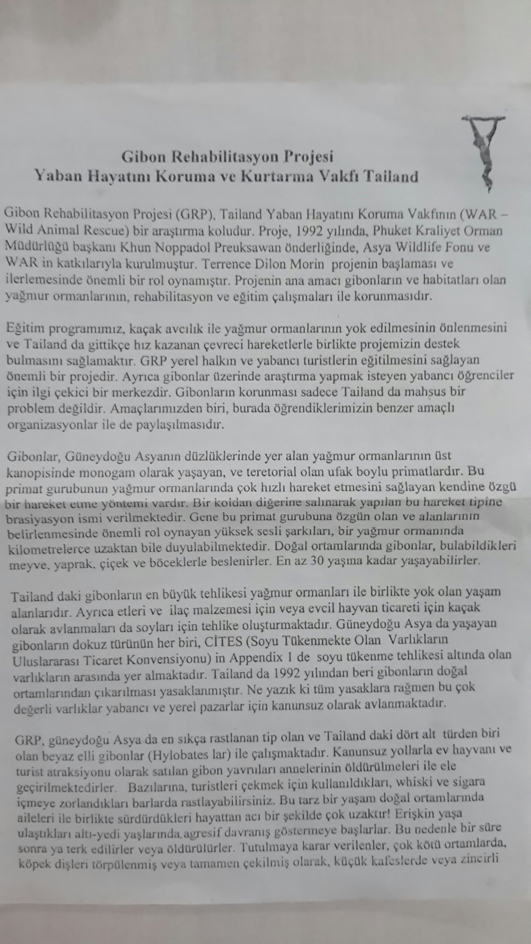 Dönüşte gibon kafeslerinin olduğu yere geldim. Burası gibon rehabilitasyon merkeziymiş. Bir kız yanıma yanaştı. Nereli olduğumu sordu. Ben de Türk’üm dedim. ” Dur ben Türkçe broşür getireyim” dedi. Ben şok oldum. Kız broşürü getirdi. Baktım halis muhlis Türkçe yazıyor. İki buçuk aydan fazla birçok ülke gezdim ilk defa Türkçe broşür gördüm. Hem de Tayland’da yağmur ormanlarının içinde bir gibon rehabilitasyon merkezinde.