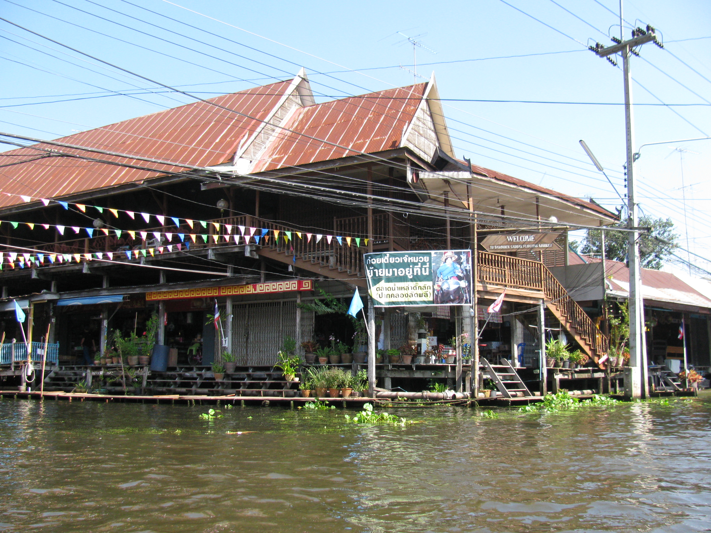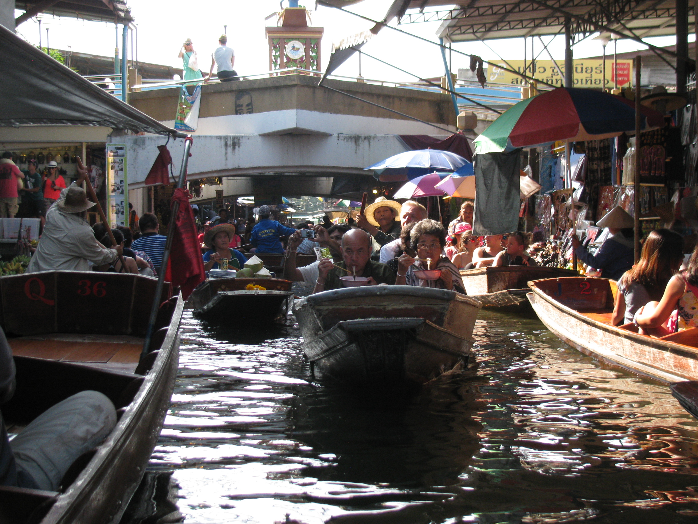 Yaklaşık bir buçuk saatlik yolculuktan sonra Yüzen markete geldik. Burası doğal oluşan bir market. Sonradan turistik yerler yapılmış ama komple bütün yüzen marketin bulunduğu semt yüzüyor. Bütün, evler, süpermarketler, turistik dükkanlar hep suyun üzerinde. Herkesin küçüklü büyüklü ince uzun kayığı var. Ben de 150 bahta bilet alıp, bir kayığa atladım marketi dolaşmaya başladım. Çok ilginç bir yer. Her türlü yiyecek, içecek, meyve ve hediyelik eşya satılıyor.