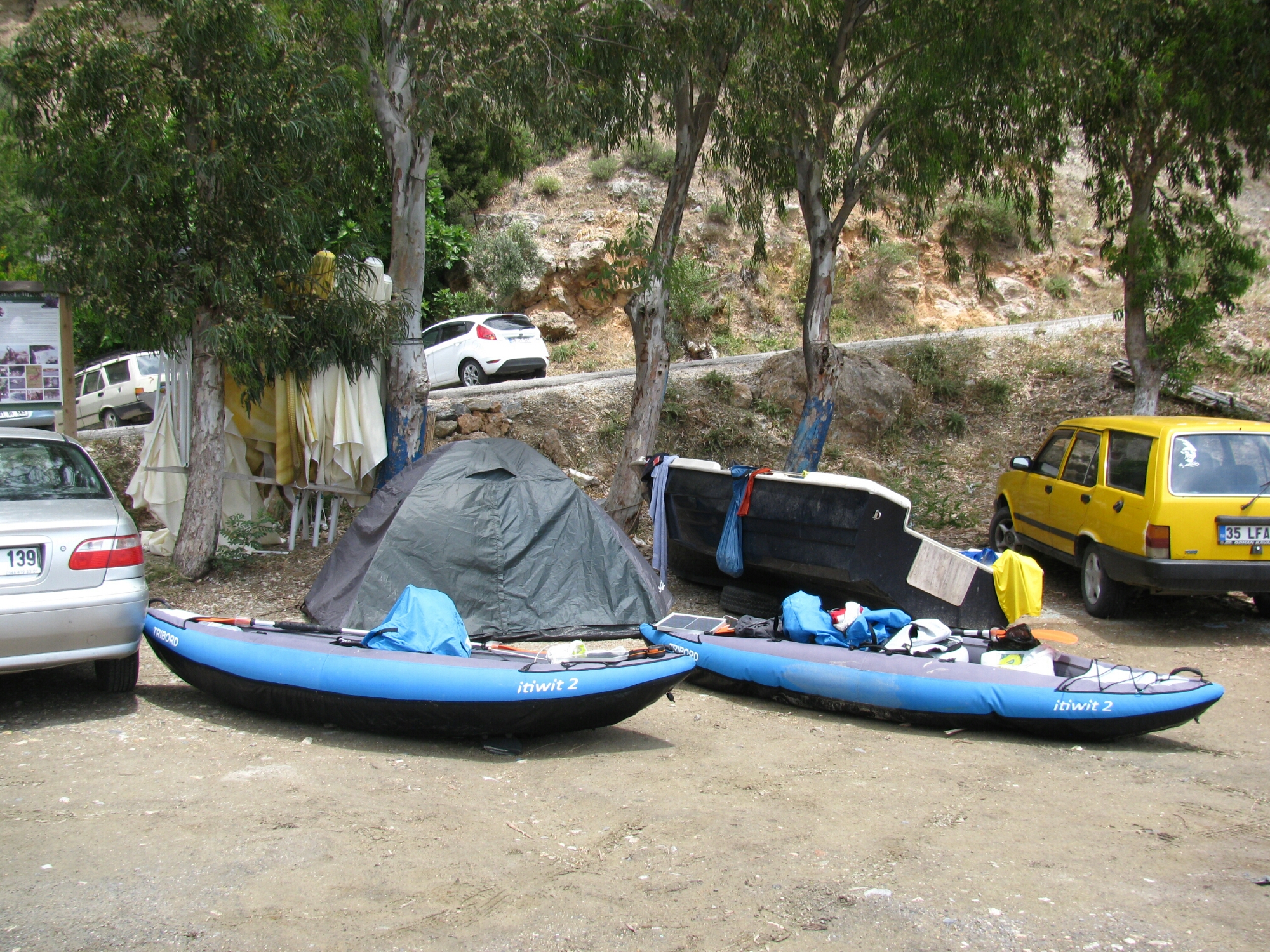 Çay molasından sonra yaklaşık bir saatlik kürek çekmeyle Karina’ya saat 11 gibi vardık. Kumsala çıkıp Karina Restoranın kumsalının dibindeki otoparka çadırımızı kurduk.